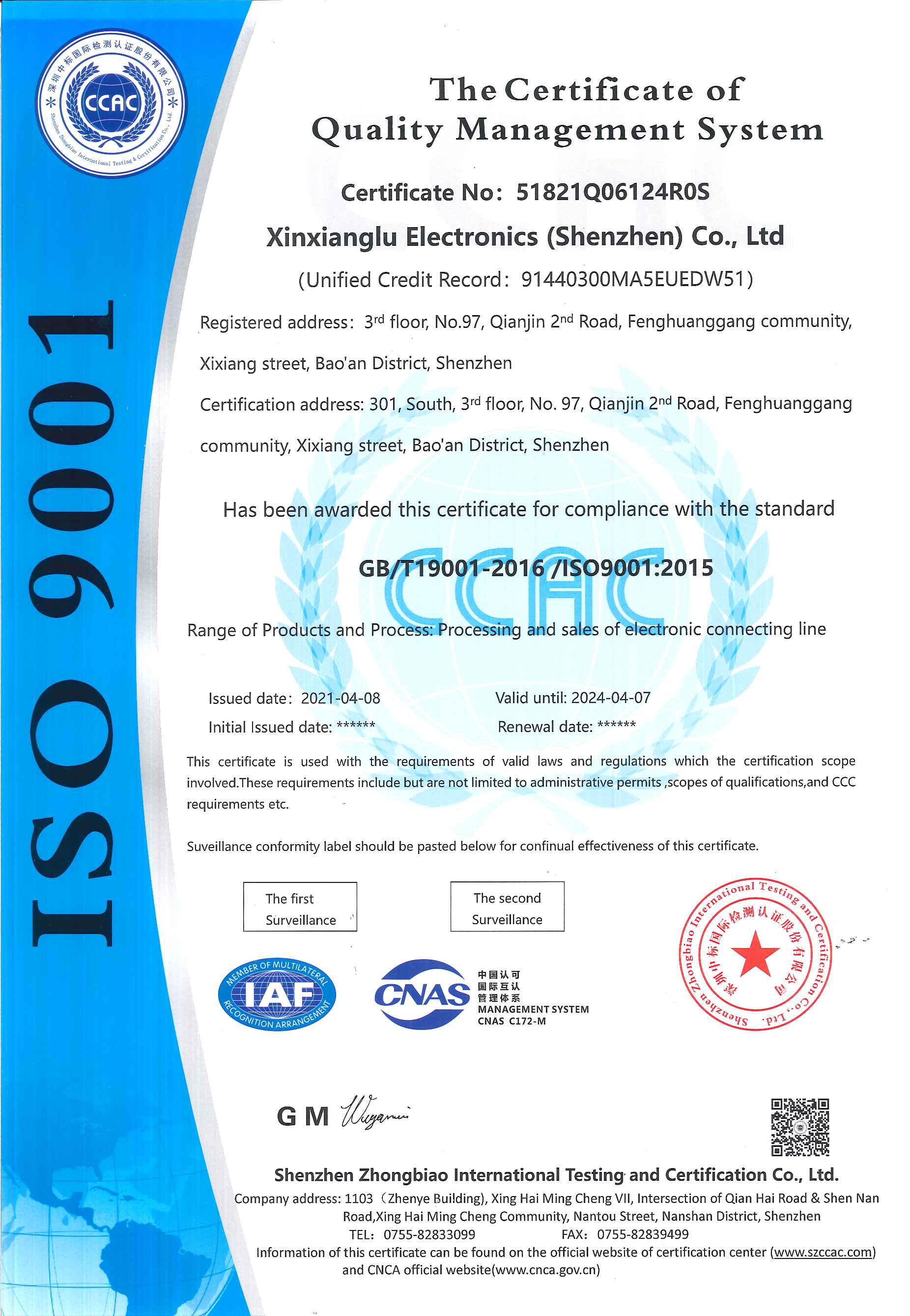 2021年鑫翔鷺電子在深圳市創思維企業管理技術服務有限公司的輔導下順利通過ISO9001質量管理體系認證。創思維專業從事客戶驗廠、認證、咨詢輔導,價格公道,服務優良,“咨詢+輔導+考勤”一站式服務保姆式輔導,全方位實時跟蹤,多年來成功幫助上萬家企業順利通過驗廠,在行業中有口皆碑!