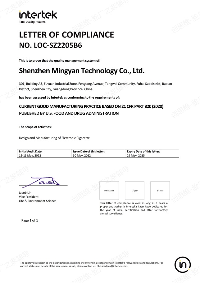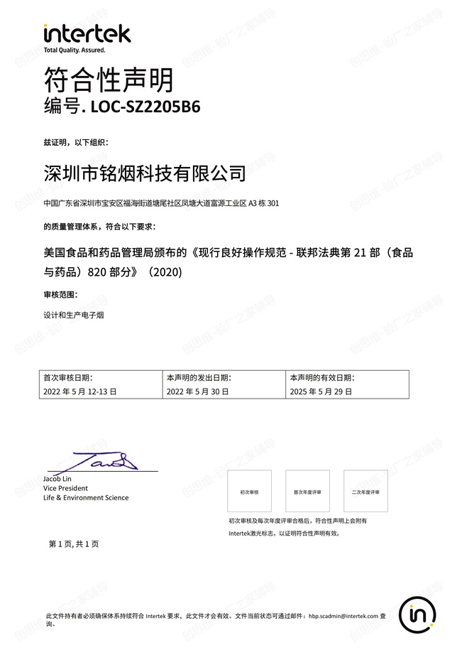 2022年5月12日-13日,國際認證機構INTERTEK(ITS) 專家及深圳市創(chuàng)思維企業(yè)管理技術有限公司技術經(jīng)理、GMP輔導老師一起,對深圳銘煙電子煙、電子霧化器生產(chǎn)基地、煙油灌裝車間、包裝車間、成品倉庫、更衣室、化學品倉等進行了GMP 820認證現(xiàn)場檢查。經(jīng)過2天嚴格、細致的檢查,順利通過檢查,并取得GMP-820認證證書。