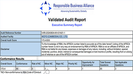 在創思維驗廠網老師專業技術、全程跟進耐心細致輔導以及公司全體員工配合下,一次性順利通過RBA認證并順利取得銀牌,為將來公司發展奠定了良好的發展基礎,既開拓了市場同時也增加了消費者對公司的信賴,在這里再次祝賀華耀(柬埔寨)有限公司 WCFO (CAMBODIA) CO., LTD. 2024年一次性成功通過RBA認證并順利取得銀牌,同時也期待未來再次與創思維驗廠網合作!